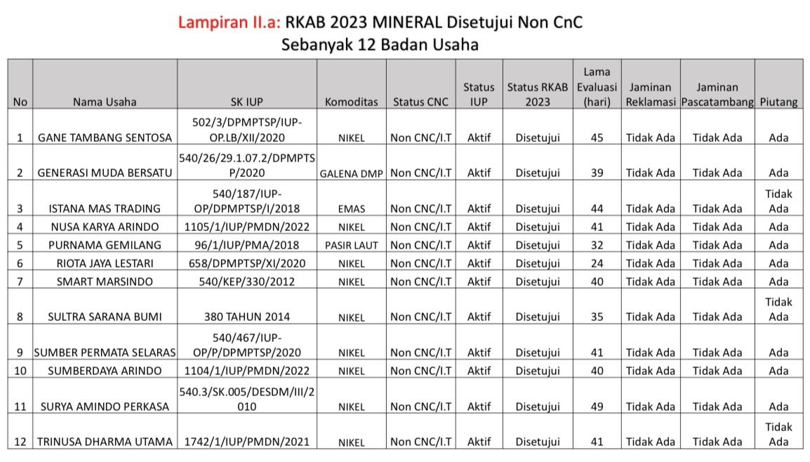 Perusahaan ini juga disinyalir belum menyampaikan jaminan rencana reklamasi dan jaminan rencana pascatambang. Juga dalam proses penerbitan IUP diduga tidak dilakukan pelelangan sebagaimana diatur dalam UU Nomor 3 Tahun 2020 Tentang Pertambangan Mineral dan Batu Bara.